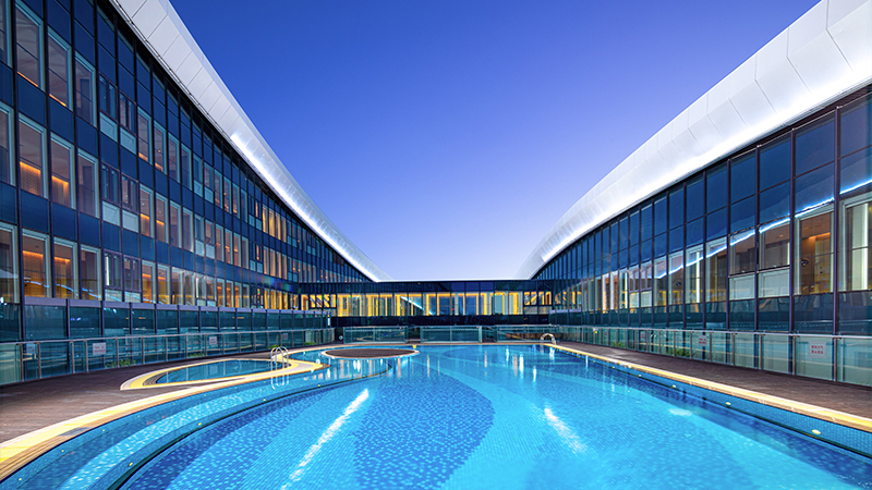 酒店建筑面积约3.2万平方米,主楼高19层,依江而建,视野开阔,四面无遮挡。环境优雅舒适,客房内配备明亮落地窗,宾客可纵览蜿蜒江景或城市繁华风貌,同时感受自然与都市的双重韵味。